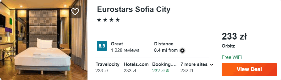Natomiast w Sofii proponuję wam noclegi w 4* hotelu Eurostars, który znajduje się w centrum miasta, nieopodal głównych atrakcji stolicy Bułgarii. Wszystkie pokoje zostały gustownie urządzone i posiadają nowoczesną łazienkę z prysznicem.