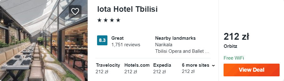 W stolicy Gruzji polecam wam noclegi w 4* hotelu Iota, który znajduje się w odległości 300 metrów od Placu Wolności. Wszystkie pokoje wyposażone są w klimatyzację, telewizor LCD oraz minibar. W każdym jest także prywatna łazienka oraz balkon lub taras.