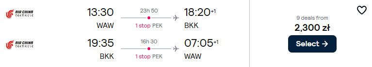 W ramach tej okazji do Tajlandii możesz wybrać się w kwietniu lub w maju. Czekają cię loty z Warszawy do Bangkoku z Air China. Na pokład możesz zabrać bagaż rejestrowany (nadawany do luku), a po drodze przesiądziesz się w Pekinie.