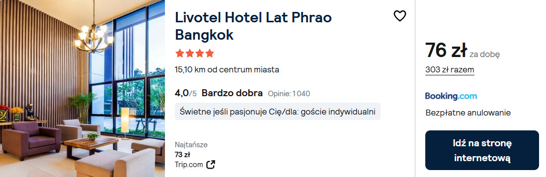 W stolicy Tajlandii po przylocie i przez kilka następnych dni możesz przenocować na przykład w 4* Livotel Hotel Lat Phrao Bangkok.
