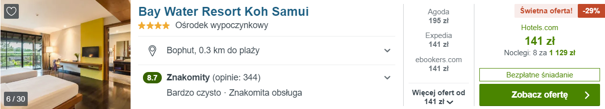 Na wyspie rekomenduję pobyt się w bardzo dobrze ocenianym, 4* kompleksie hotelowym Baywater Resort Samui. Wystarczy zobaczyć kilka zdjęć obiektu, aby przekonać się, że to będzie dobry wybór. W cenę pobytu wliczone są śniadania.