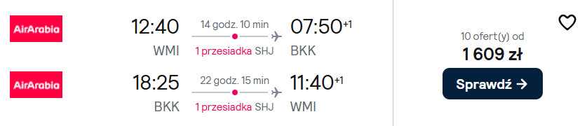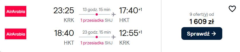 Do Tajlandii (Bangkok, Krabi, Phuket) polecisz z Krakowa oraz warszawskiego lotniska w Modlinie linią Air Arabia z przesiadkami na lotnisku w Szardży. W cenę biletu zawsze wliczony jest bagaż podręczny, a ten nadawany do luku dokupisz w atrakcyjnej cenie (ok. 13 EUR – w jedną stronę/ ok. 55 PLN).