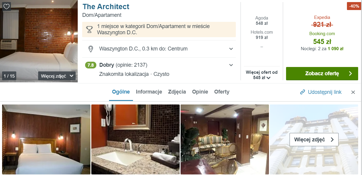 W Waszyngtonie proponuję zatrzymać się w apartamentowcu The Architect, który zlokalizowany jest w ścisłym centrum miasta.