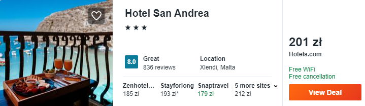 Na Gozo polecam wam noclegi w 3* hotelu San Andrea. To bardzo dobrze oceniany obiekt, z którego rozpościerają się wspaniałe widoki na morze. Na miejscu będziecie mogli skorzystać z darmowego Wi-Fi.