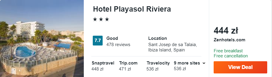 Dowiedzcie się więcej o tym hoteluNatomiast na hiszpańskiej wyspie proponuję wam noclegi z codziennymi śniadaniami w 3* hotelu Playasol Riviera, który znajduje się nieopodal zatoki San Antonio. Na miejscu zapewniony będziecie mieli dostęp do tarasu słonecznego, odkrytego basenu oraz sieci WiFi.