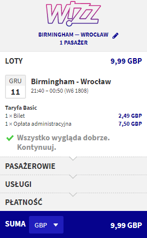Wizz Air | Birmingham 21:40 – Wrocław 00:50 | 9,99 GBP (ok. 46 PLN) (WDC) | 11 (12) grudnia