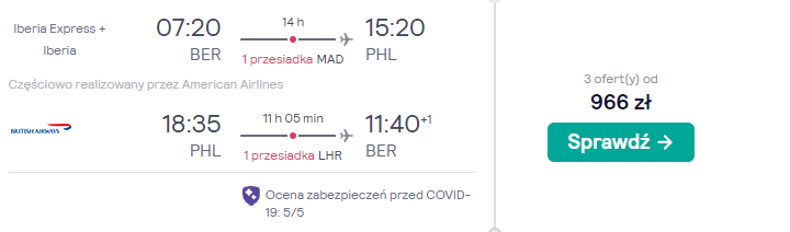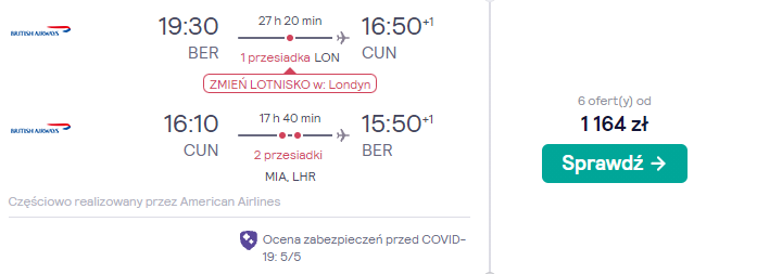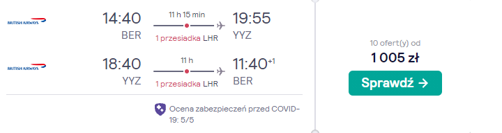 Bilety w tak niskich cenach kupicie na loty z Berlina. Czekają was podróże na pokładzie samolotów linii lotniczej British Airways z bezpiecznymi, gwarantowanymi przez przewoźnika przesiadkami w Londynie, Madrycie oraz w niektórych przypadkach w USA. W cenę wliczono tylko bagaż podręczny, dlatego przed wyjazdem zapoznajcie się z przygotowanym przez nas poradnikiem dotyczącym pakowania się.