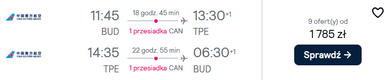 Do Azji udasz się w terminach od listopada do grudnia z lotniska w Budapeszcie.Do Chin lub Tajwanu, w zależności od wybranego terminu, polecisz liniami China Southern, Hainan Airlines lub Air China, z przesiadką w jednym z chińskich miast. W każdej z wymienionych linii w cenę biletu wliczony jest bagaż podręczny i rejestrowany.