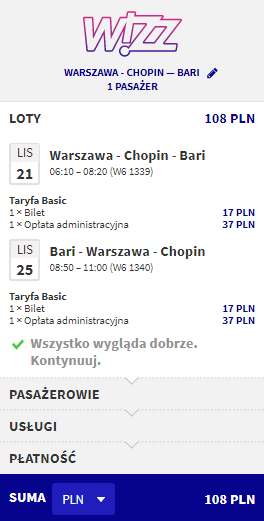 Najtańsze bilety są dostępne dla członków Wizz Discount Club, a zapłacicie za nie dowolną kartą płatniczą. Bez dodatkowych opłat podróżować będziecie z bagażem podręcznym o maksymalnych wymiarach 55 x 40 x 23 cm i wadze nieprzekraczającej 10 kg.