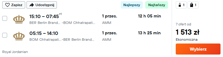 Bilety do Azji w tak niskiej cenie zarezerwujesz na loty z Berlina. Czeka cię podróż do Mumbaju z Royal Jordanian, a po drodze przesiądziesz się w Ammanie.