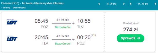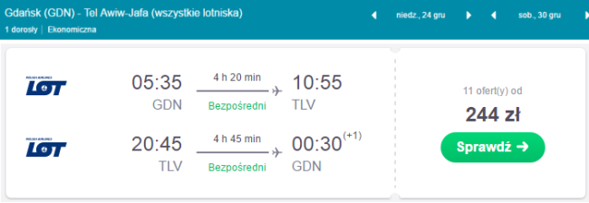 Atrakcyjne ceny za bezpośrednie przeloty PLL LOT do Izraela z regionalnych portów w Polsce. Boże Narodzenie w Ziemii Świętej? Sylwester na plaży? Już teraz zaplanujcie swój zimowy wypoczynek. Jerozolima modli się, Hajfa pracuje, a Tel Awiw bawi. Takie powiedzenie możecie często usłyszeć. Czy jest prawdziwe? Przekonajcie się sami. Izrael ma wiele do zaoferowania. Bogata historia, niezwykła architektura, rozpalone słońcem plaże Morza Śródziemnego, Czerwonego i Martwego. Wiele miejsc kultu religijnego. Kupcie tanie bilety i przekonajcie się sami, jak niezwykłym miejscem jest ten kraj położony na Bliskim Wschodzie.