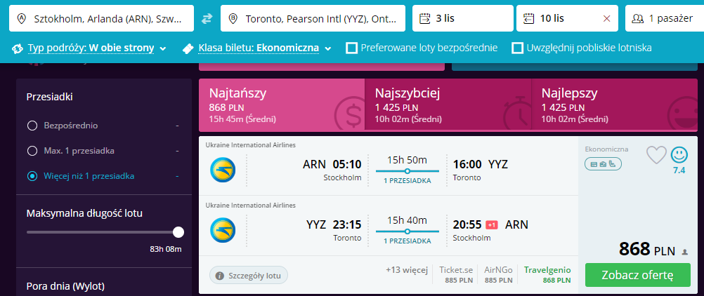 Bardzo tanie loty do Kanady (Toronto) ze Sztokholmu od 868 PLN