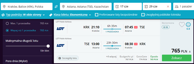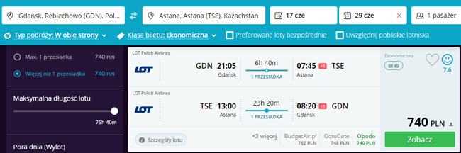 Podróż do Kazachstanu odbędziecie z przesiadkami z Warszawie. W cenie biletu wliczony jest bagaż podręczny oraz rejestrowany (nadawany do luku bagażowego).