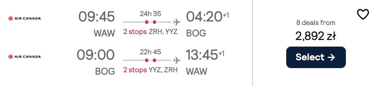Do Ameryki Południowej udasz się w terminach od marca do kwietnia z warszawskiego lotniska im. Fryderyka Chopina. Do Bogoty polecisz linią Air Canada z przesiadkami w Niemczech lub Szwajcarii w i Kanadzie. W cenę biletu wliczony jest bagaż podręczny.
