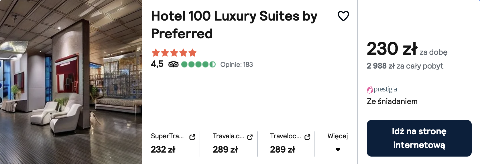 Jeżeli cenisz sobie najwyższy standard, postaw na 5* hotel 100 Luxury Suites. Na terenie obiektu znajdziesz między innymi siłownię, bar, restaurację oraz strefę spa. W cenę noclegu również zostały wliczone śniadania.