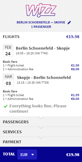 Bilety kupicie na wizzair.com. Najniższa cena dostępna jest dla posiadaczy Wizz Discount Club. Podróż z małym bagażem podręcznym o maksymalnych wymiarach 42 x 32 x 25 cm.