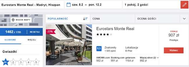 Sprawdźcie ceny hoteli w Madrycie. Dobrym wyborem może być 4* hotel Eurostars Monte Real. Usytuowany jest on w eleganckiej dzielnicy Puerta de Hierro w Madrycie, 10 minut jazdy od placu Plaza de Cuzco i alei Paseo de la Castellana. W obiekcie dostępna jest restauracja oraz centrum fitness. Dojazd z obiektu do centrum Madrytu zajmuje 25 minut.