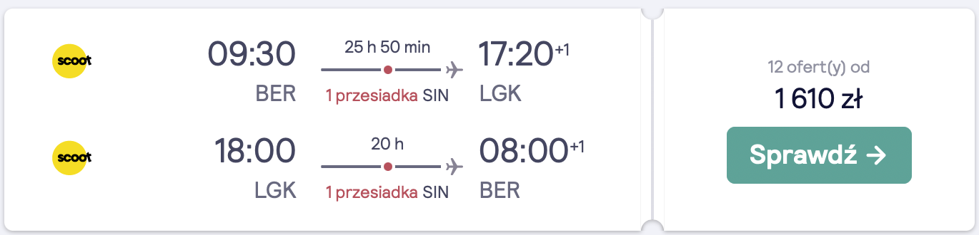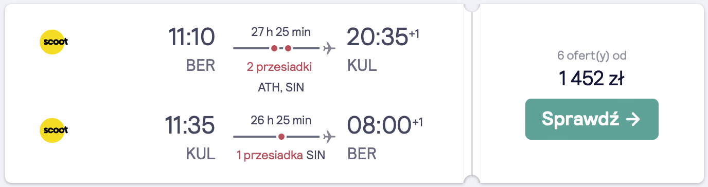 Do Azji polecicie na pokładzie samolotów linii lotniczych Scoot z lotniska w Berlinie. Możecie wybrać się do Kuala Lumpur lub na Penang albo Langkawi. Po drodze czekają was przesiadki na lotnisku w Atenach i Singapurze.
