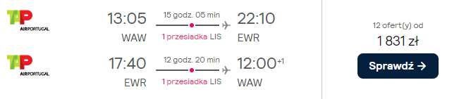 W podróż do Nowego Jorku udasz się z Warszawy. Czekają cię loty realizowane na pokładzie samolotów linii lotniczej TAP Air Portugal z bezpiecznymi, gwarantowanymi przez przewoźnika przesiadkami w Lizbonie.