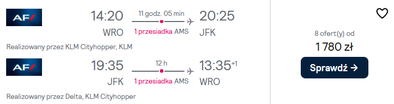 Do USA wybierzesz w się w marcu i kwietniu z lotnisk we Wrocławiu, Gdańsku, Krakowie lub Warszawie. Podróż odbędziesz liniami KLM oraz Air France z przesiadkami w Amsterdamie lub Paryżu. W cenę biletu wliczony został bagaż podręczny.