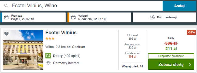 Poza zakupie biletów lotniczych czas na komfortowe zakwaterowanie. W przykładowym terminie 20-22 lipca proponuję pobyt w Ecotel Vilnius, gdzie za pokój dla 2 osób ze śniadaniami zapłacicie 211 PLN/noc/2 os. Hotel jest zlokalizowany w centrum miasta. Do dyspozycji gości jest bezpłatne wi-fi oraz TV-Sat.