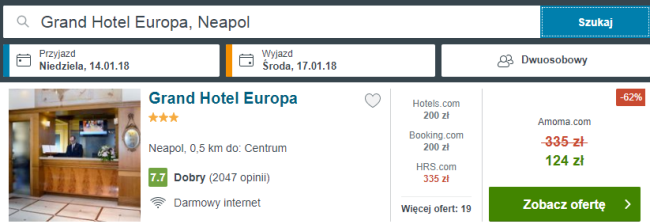 W Neapolu polecam wybrać Grand Hotel Europa za 124 PLN/noc/pokój. Obiekt usytuowany jest w XIX-wiecznym, eleganckim budynku. Pobliski transport publiczny ułatwia zwiedzanie najciekawszych i najważniejszych zakątków oraz zabytków miasta. Wszystkie pokoje wyposażone są w łazienkę, telefon, sejf oraz telewizor z TV kablową i dostęp do Internetu.