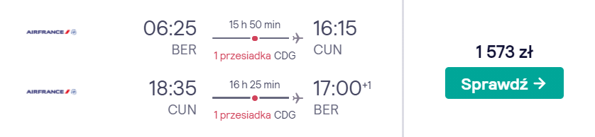 Do Cancun podróżować będziecie samolotem linii Air France z krótkimi przesiadkami na lotnisko w stolicy Francji. W razie jakichkolwiek opóźnień wynikających z winy przewoźnika otrzymacie bezpłatnie nowy bilet na dalszą drogę. Bez dodatkowych kosztów zabrać ze sobą będziecie mogli bagaż podręczny oraz przedmiot osobisty (mały plecak lub damską torebkę).