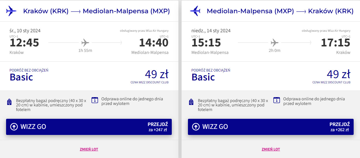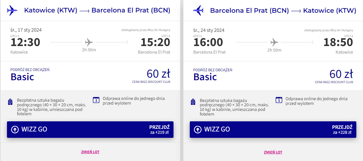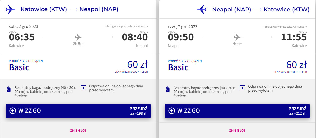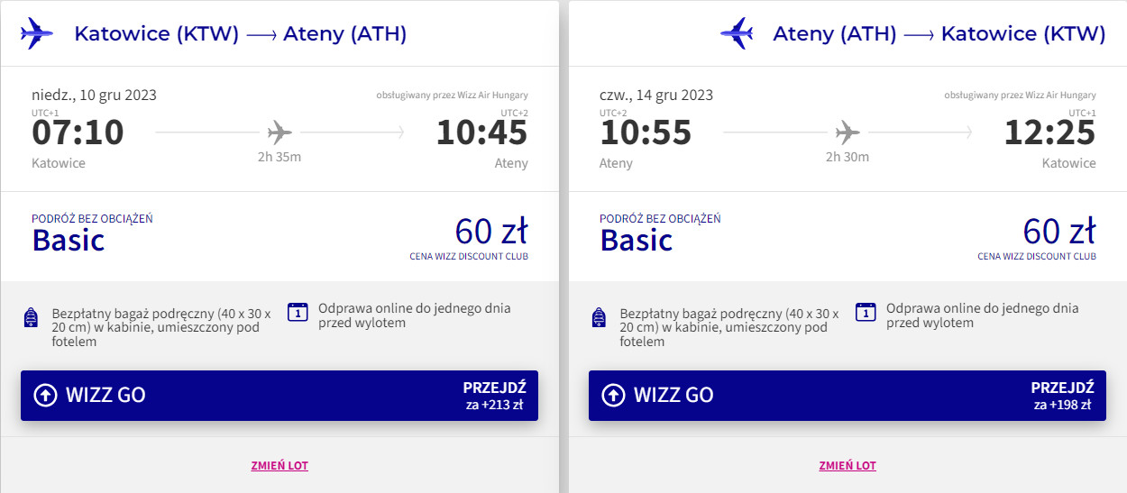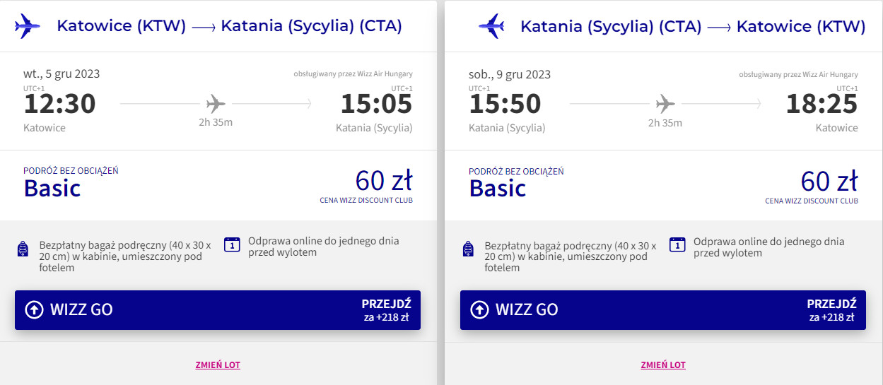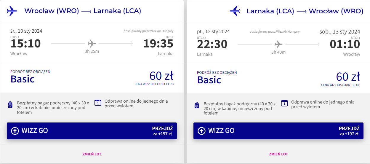Na każdej trasie polecisz bezpośrednio na pokładzie samolotu linii Wizz Air z wliczonym małym bagażem podręcznym. Bilety w najniższej cenie dostępne są dla członków Wizz Discount Club. Chętni na loty bez WDC zapłacą nieco więcej.
