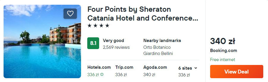 W Katanii wybrałem noclegi w bardzo dobrym 4* hotelu Four Points by Sheraton Catania, który oferuje panoramiczny widok na Etnę i pobliską zatokę. W każdym pokoju jest łazienka z wanną i prysznicem.