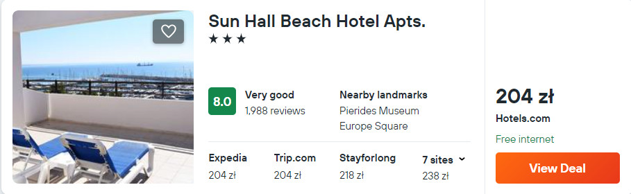 W Larnace proponuję ci noclegi w 3* kompleksie Sun Hall Beach Hotel Apartments, który znajduje się w sąsiedztwie mariny oraz plaży Finikoudes. Każde studio składa się z aneksu kuchennego z miejscem do relaksu, sypialni oraz łazienki. W cenie zapewniony będziesz mieć dostęp do sieci WiFi.
