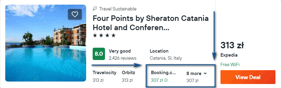 Natomiast w Katanii rekomenduję ci noclegi w 4* hotelu Four Points by Sheraton. Każdy pokój wyposażony jest w klimatyzację z funkcją ogrzewania, telewizor LCD, minibarek oraz czajnik elektryczny. W łazience jest prysznic, suszarka do włosów oraz podstawowe przybory toaletowe.
