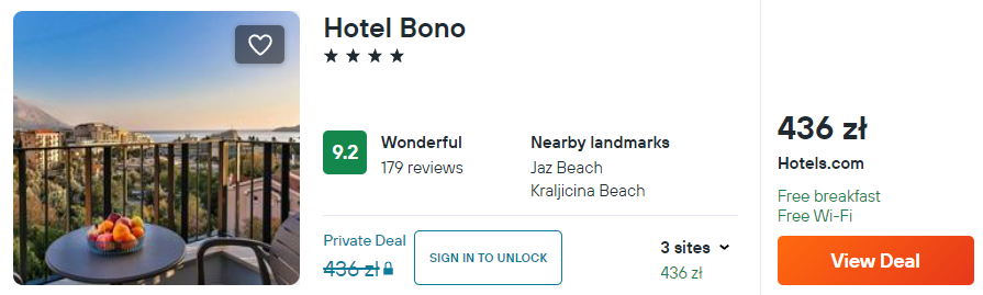 Natomiast w Budvie wybrałem dla ciebie 4* hotel Bono. W cenę zakwaterowania wliczono codzienne śniadania.