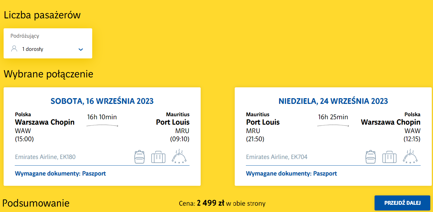 Do Afryki udasz się w terminie 16(17)-24 września. Czeka cię podróż z Warszawy na Mauritius, realizowana na pokładzie samolotów linii lotniczej Emirates. Po drodze zaplanowano bezpieczne, gwarantowane przez przewoźnika przesiadki w Dubaju.