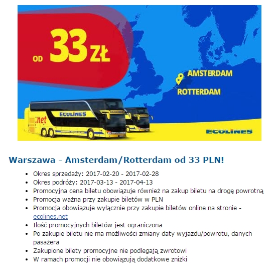 Bilety rezerwujecie na stronie Ecolines. Obniżka obejmuje podróże od 13 marca do 13 kwietnia tego roku. Bilety zarezerwujecie do 28 lutego. Udanych zakupów i miłej podróży!