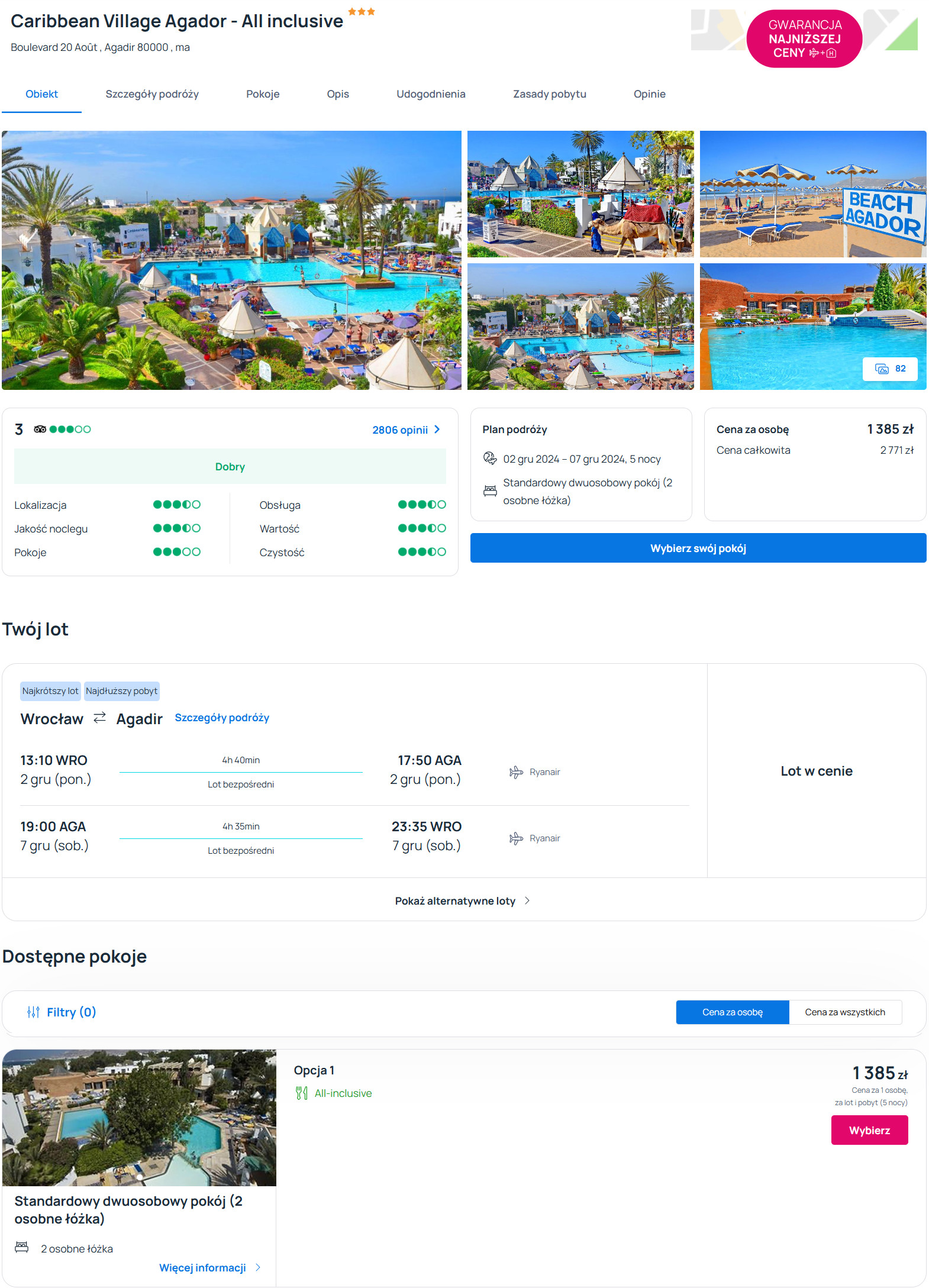 W Agadirze zatrzymasz się w 3* hotelu Caribbean Village Agador z all inclusive. Znajduje się on w odległości 3 minut spacerem od plaży, na której wydzielona jest strefa dla gości hotelowych. Na terenie obiektu mieszczą się dwa odkryte baseny, kort do gry w tenisa oraz centrum fitness. Każdy pokój posiada łazienkę z prysznicem. W cenie zapewniony będziesz miał dostęp do sieci WiFi.