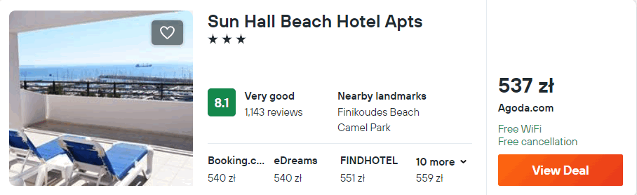 W Larnace zakwaterowany będziesz w 3* hotelu apartamentowym Sun Hall Beach, który znajduje się w sąsiedztwie plaży Finikoudes. Z lotniska w okolice miejsca noclegowego dojedziesz autobusem lub wypożyczonym samochodem – szczegóły poniżej.