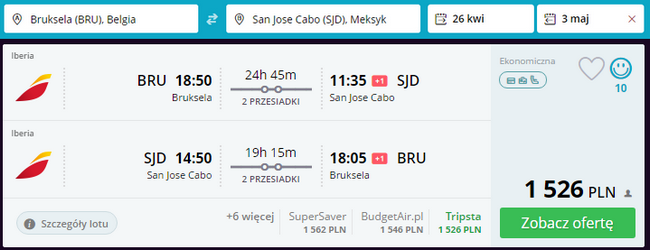 Bruksela – San Jose Cabo – Bruksela za 1526 PLNTerminy od stycznia do maja
