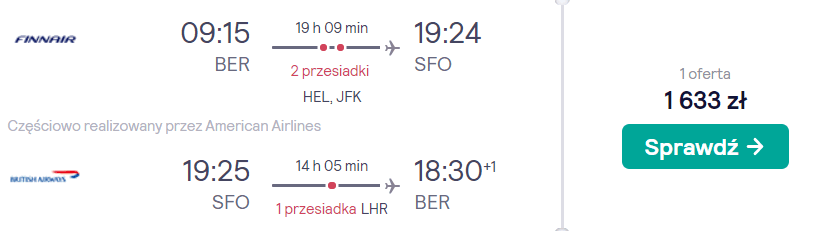 Podróż do Stanów rozpoczniecie i zakończycie na berlińskiego portu lotniczego im. Willy’ego Brandta. W obie strony polecicie na pokładach samolotów wchodzących w skład sojuszu One World (American Airlines, British Airways lub Finnair). Po drodze czekać was będą wygodne przesiadki na lotniskach w Europie oraz w niektórych przypadkach na terenie USA. W cenie biletu zabrać ze sobą będziecie mogli bagaż podręczny oraz przedmiot osobisty (mały plecak lub damską torebkę).
