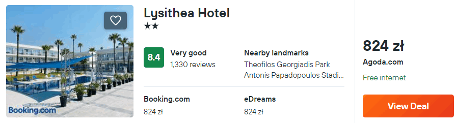 W Larnace zatrzymasz się w hotelu Lysithea, który znajduje się w spokojnej części miasta, tuż przy plaży CTO Pyla. Z lotniska w okolice miejsca zakwaterowania (przystanek Eac Dekeleia Roundabout 1) dojedziesz autobusem nr 425 lub wypożyczonym samochodem.