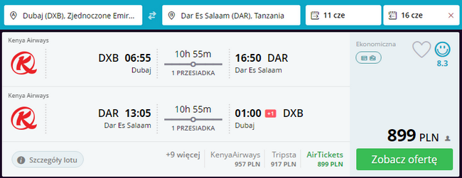 Kenya Airways | Dubaj 06:55 – Dar Es Salaam 16:50 | 899 PLN | 11 czerwca