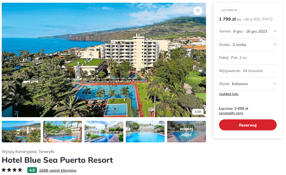 Do Hiszpanii udasz się w terminie 8 – 16 grudnia. Czeka cię bezpośredni lot z Katowic na Teneryfę, realizowany na pokładzie samolotu linii lotniczej Wizz Air. W cenę pakietu wliczono bagaż rejestrowany (nadawany do luku) transfery na trasie lotnisko – hotel – lotnisko, podstawowe ubezpieczenie oraz wyżywienie w formule all inclusive.