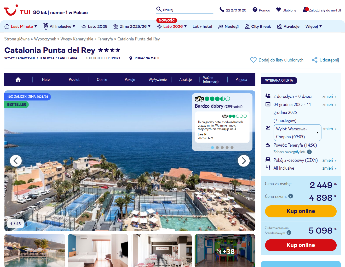 W cenie otrzymasz przeloty z bagażem, transfery lotniskowe, zakwaterowanie oraz all inclusive. Dodatkowo w pakiecie znajduje się podstawowe ubezpieczenie oraz wsparcie TUI Service Center dostępne 24/7.