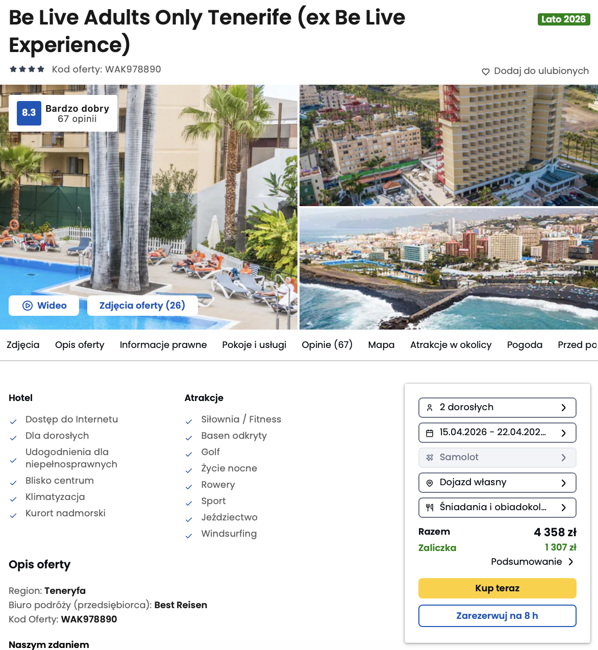 🛏️ Zakwaterowanie: 4* hotel Be Live Adults Only Tenerife