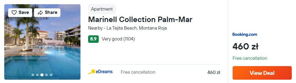 Natomiast na Teneryfie rozważ pobyt w kompleksie Marinell Collection Palm-Mar, który od plaży Arenita oddalony jest o 10 minut spokojnego spaceru. Każdy apartament składa się z aneksu kuchennego, salonu, sypialni oraz łazienki. Na terenie obiektu mieszczą się dwa odkryte baseny oraz centrum fitness.