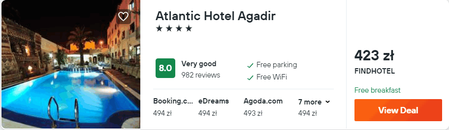 Natomiast w Agadirze zatrzymajcie się w 4* hotelu Atlantic, który znajduje się nieopodal ogrodu Jardin Ibn Zaidoun oraz miejskiej plaży. W cenie zakwaterowani zapewnione będziecie mieli codzienne śniadania, dostęp do sieci WiFi oraz odkrytego basenu.