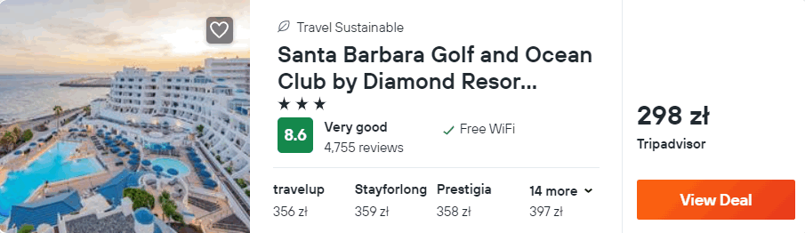 Na Teneryfie rekomenduję wam noclegi w 3* hotelu Santa Barbara Golf and Ocean Club by Diamond Resorts, który znajduje się na południowym wybrzeżu wyspy, nieopodal plaży San Blas. Na terenie kompleksu są dwa odkryte baseny oraz taras z leżakami, a we wszystkich pomieszczeniach będziecie mieli zapewniony dostęp do sieci WiFi.