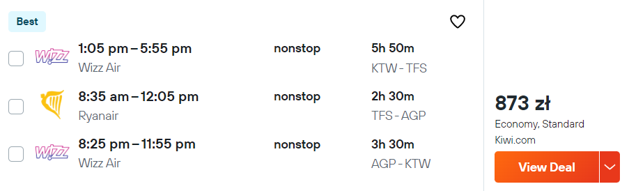 Na wyjazd udasz się z katowickiego portu lotniczego im. Wojciech Korfantego w maju. Podróż składa się z trzech niezależnych przelotów (Katowice-Teneryfa, Teneryfa-Malaga oraz Malaga-Katowice), które zarezerwujesz jednym kliknięciem. Z Polski (w obie strony) polecisz na pokładach samolotów linii Wizz Air. Natomiast lot krajowy w Hiszpanii pokonasz samolotem linii Ryanair.