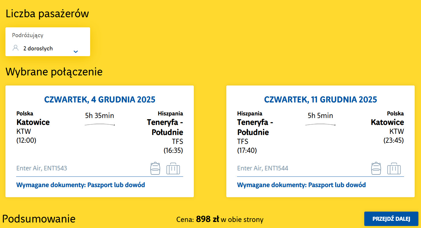 Na największą wyspę archipelagu Wysp Kanaryjskich (Teneryfę) polecisz bezpośrednio z Katowic czarterową linią Enter Air. W cenę wliczony jest bagaż rejestrowany (nadawany do luku) oraz podręczny.
