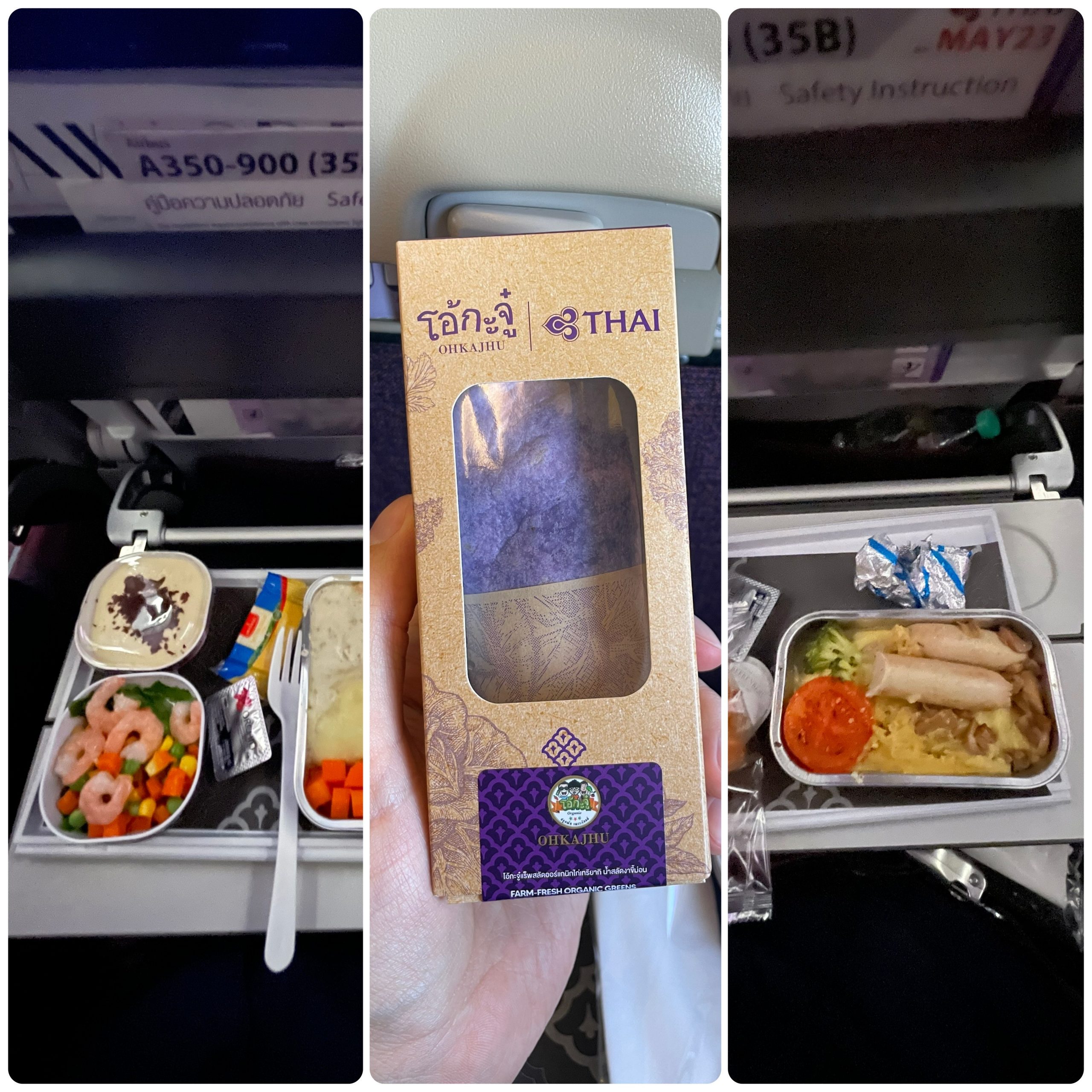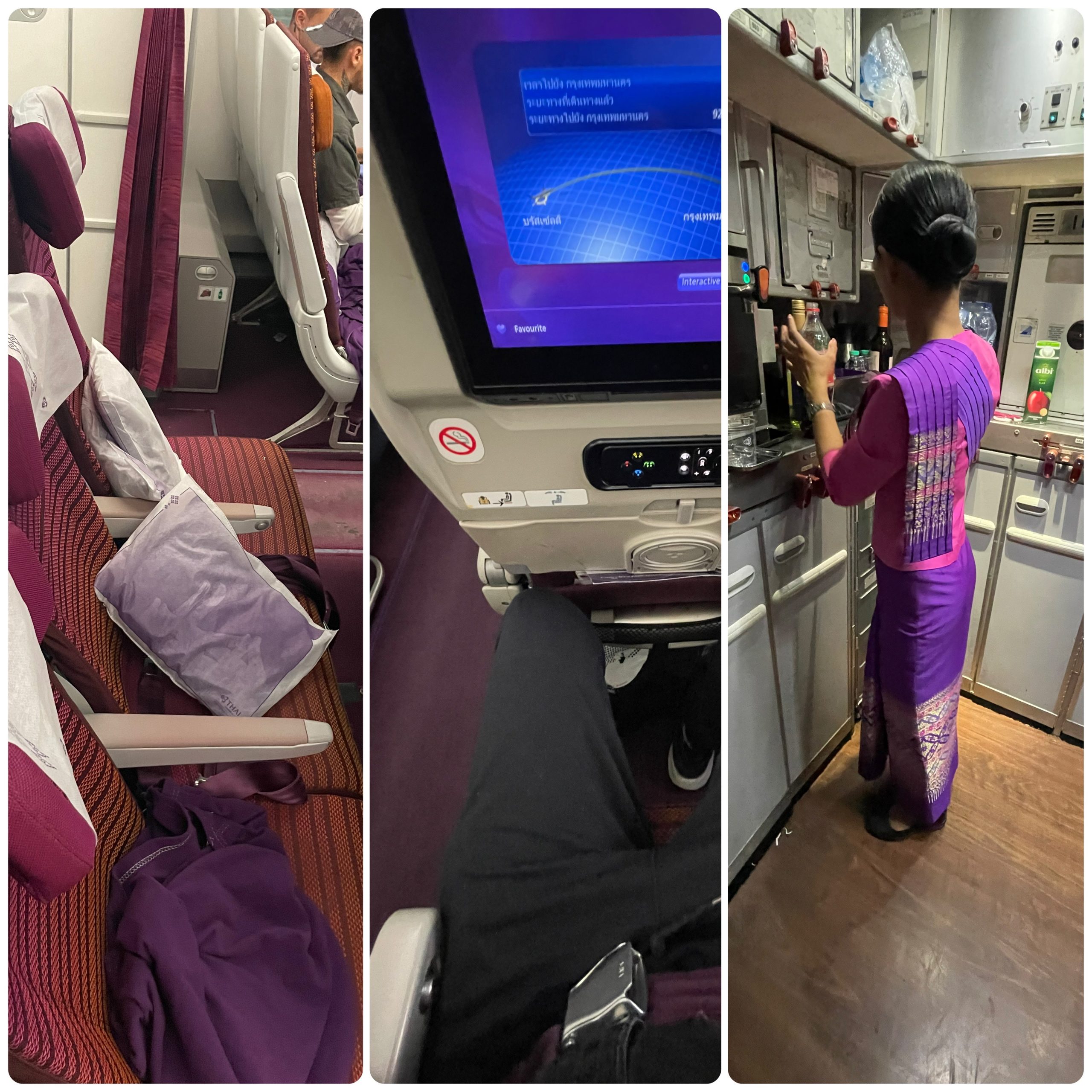 Bez uprzedniego zamówienia specjalnego posiłku jesteśmy (jak to zwykle bywa) skazani na wybór serwowany przez linię. Tym razem miła niespodzianka i bardzo lokalny akcent: w jedną stronę można dostać wołowinę wydaniu pad kra pao (z bazylią i chili), w drugą nawet krewetki. Śniadanie niestety nie powala i za każdym razem jest to wariacja na temat parówki z dodatkami. Pod tym względem dużo lepiej prezentował się catering na krótkich trasach (tak, nawet na nieco ponad godzinnym locie Thai Airways karmi pasażerów), gdzie można było dostać m.in. takiego fioletowego wrapa z kurczakiem teriyaki.