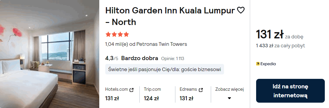 Preferujesz zakwaterowanie w hotelu? W takim razie postaw na pobyt w 4* hotelu Hilton Garden Inn Kuala Lumpur. Każdy pokój jest wyposażony w klimatyzację, telewizor LCD, minibar oraz czajnik elektryczny.